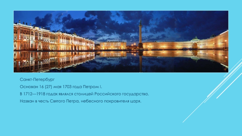 Санкт-ПетербургОснован 16 (27) мая 1703 года Петром I. В 1712—1918 годах являлся столицей Российского государства.Назван в честь