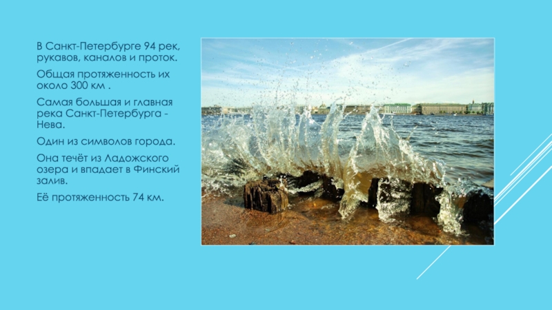 В Санкт-Петербурге 94 рек, рукавов, каналов и проток.Общая протяженность их около 300 км .Самая большая и главная