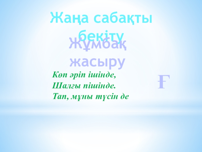 Жаңа сабақты бекітуКөп әріп ішінде,Шалғы пішінде.Тап, мұны түсін деЖұмбақ жасыруҒ