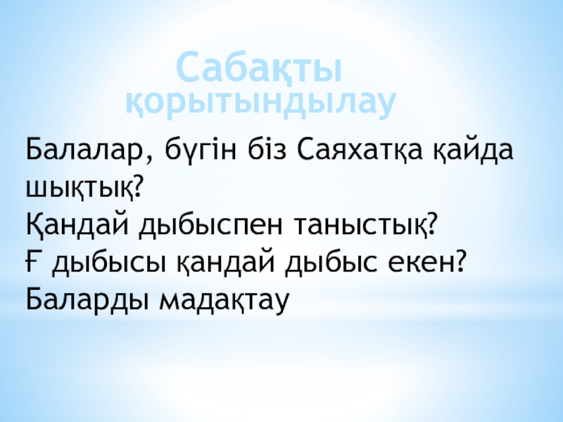 Балалар, бүгін біз Саяхатқа қайда шықтық?Қандай дыбыспен таныстық?Ғ дыбысы қандай дыбыс екен?Баларды мадақтау