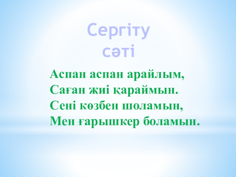 Сергіту сәтіАспан аспан арайлым,Саған жиі қараймын.Сені көзбен шоламын,Мен ғарышкер боламын.