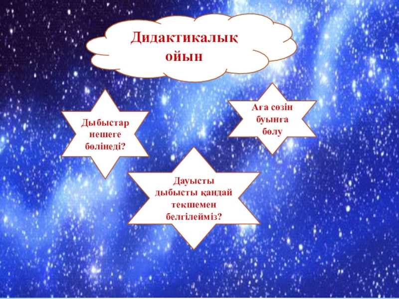 Дидактикалық ойынДыбыстар нешеге бөлінеді?Дауысты дыбысты қандай текшемен белгілейміз?Аға сөзін буынға бөлу