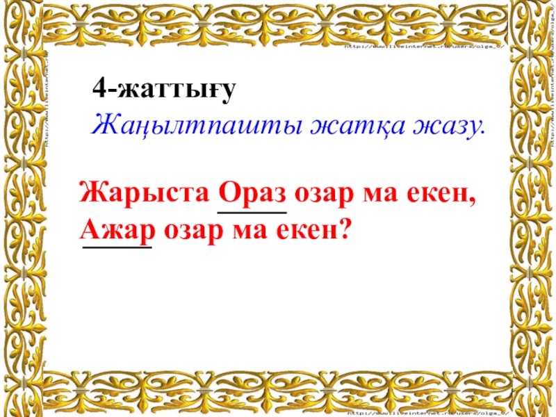 4-жаттығу Жаңылтпашты жатқа жазу.Жарыста Ораз озар ма екен,Ажар озар ма екен?