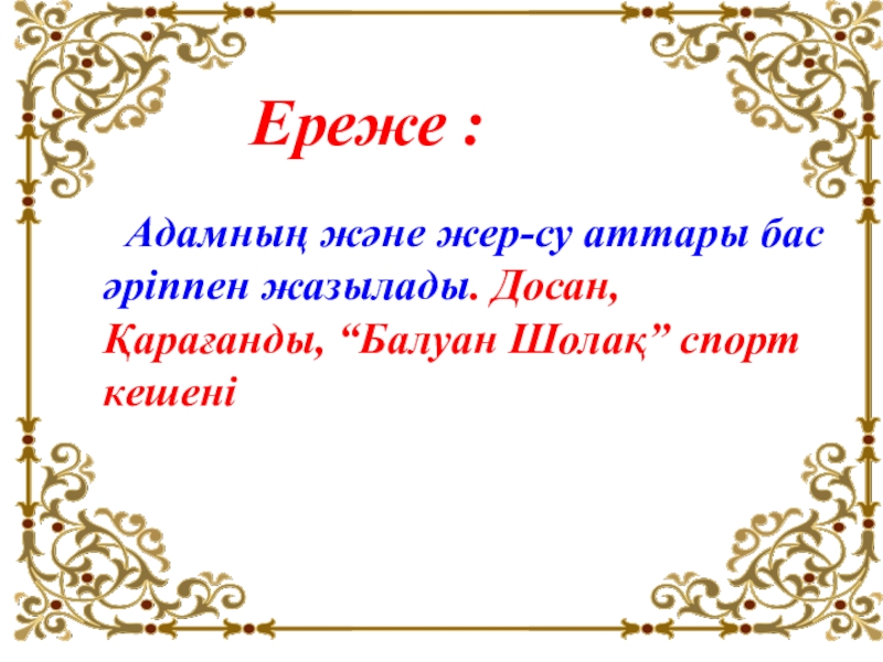 Ереже :      Адамның және жер-су аттары бас әріппен жазылады. Досан,  Қарағанды,