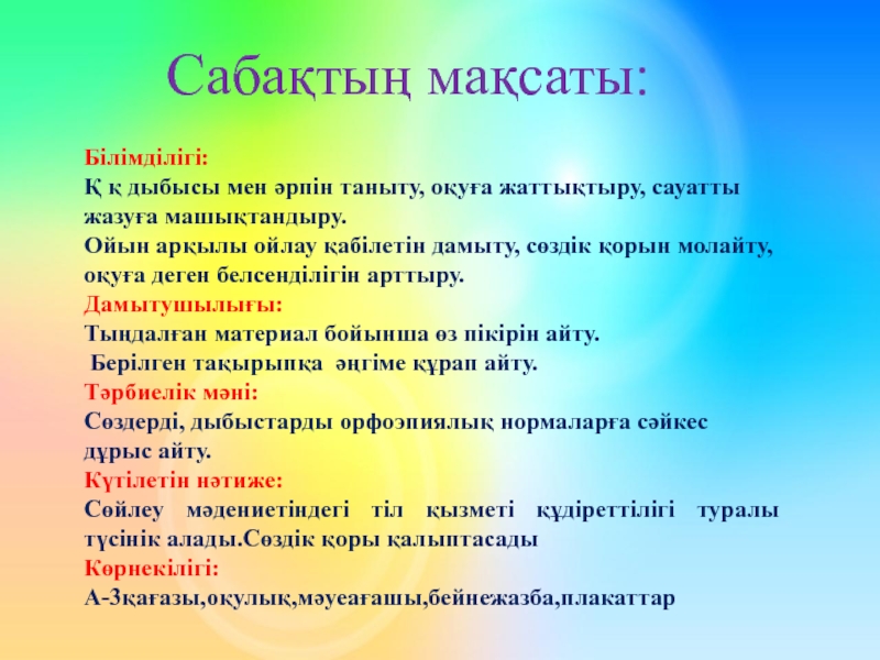 Сабақтың мақсаты:Білімділігі:Қ қ дыбысы мен әрпін таныту, оқуға жаттықтыру, сауатты жазуға машықтандыру. Ойын арқылы ойлау қабілетін дамыту, сөздік қорын