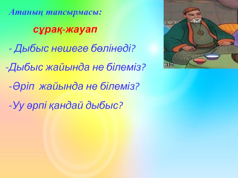 Атаның тапсырмасы:     сұрақ-жауап- Дыбыс нешеге бөлінеді?Дыбыс жайында не білеміз? -Әріп жайында не білеміз?-Уу