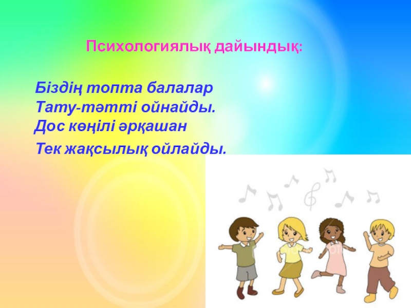 Психологиялық дайындық: Біздің топта балалар Тату-тәтті ойнайды. Дос көңілі әрқашан Тек жақсылық ойлайды.