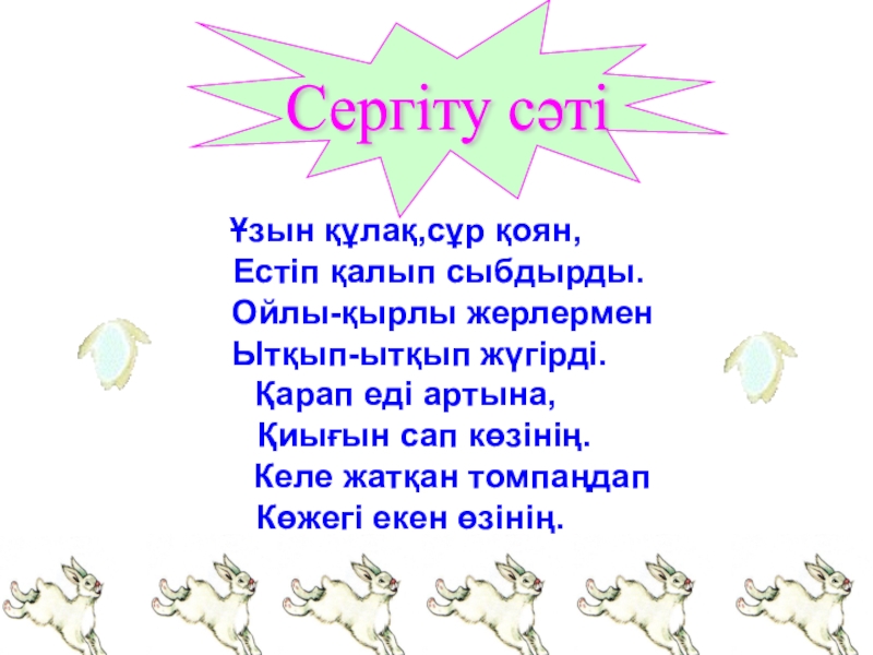 Тәрбиелілігі: Өлең айтқызу, жұмбақ жасыру арқылы туған жерді, жануарларды, т.б. қорғауға тәрбиелеу