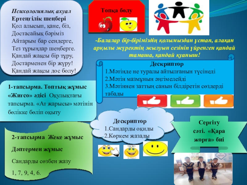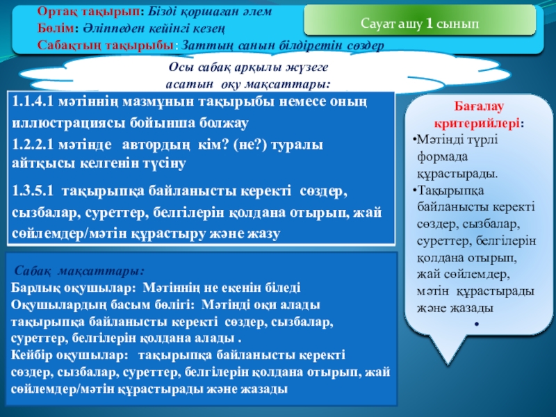 Оқушылардың басым бөлігі: Мәтінді оқи алады тақырыпқа байланысты керекті сөздер, сызбалар, суреттер, белгілерін қолдана алады .