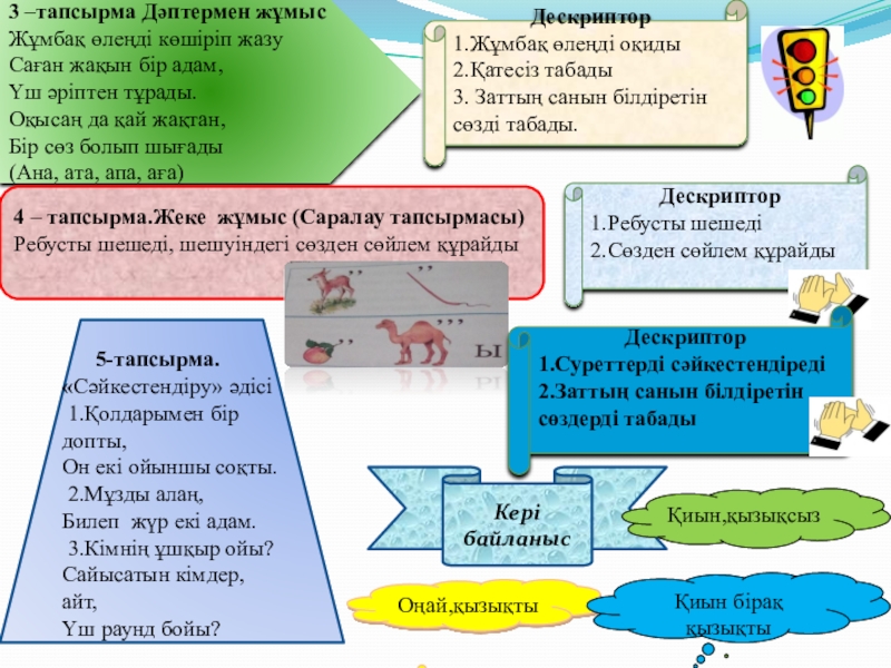 Кейбір оқушылар: тақырыпқа байланысты керекті сөздер, сызбалар, суреттер, белгілерін қолдана отырып, жай сөйлемдер/мәтін құрастырады және жазады