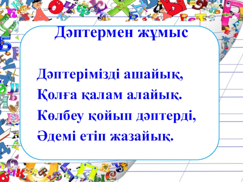 Дәптермен жұмыс       Дәптерімізді ашайық,    Қолға қалам