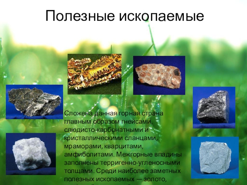сланцами, мраморами, кварцитами, амфиболитами. Межгорные впадины заполнены терригенно-угленосными толщами. Среди наиболее заметных полезных ископаемых — золото, графит, бокситы, асбест, фосфориты.