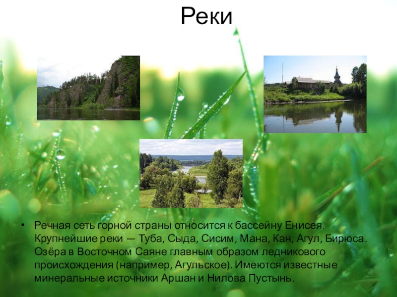 Туба, Сыда, Сисим, Мана, Кан, Агул, Бирюса. Озёра в Восточном Саяне главным образом ледникового происхождения (например, Агульское). Имеются известные минеральные источники Аршан и Нилова Пустынь.