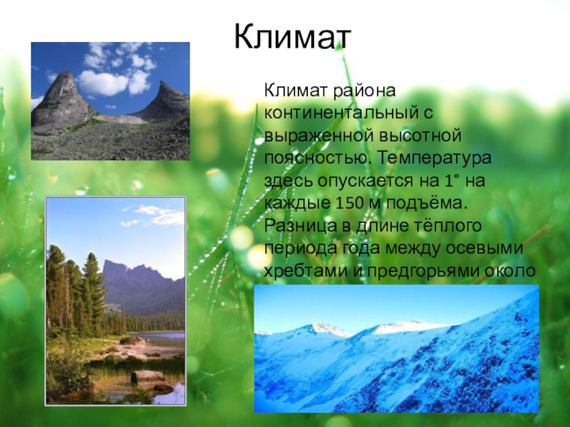 Климат района континентальный с выраженной высотной поясностью. Температура здесь опускается на