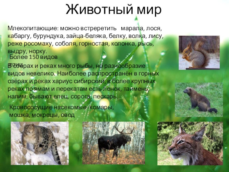 Млекопитающие: можно встреретить марала, лося,кабаргу, бурундука, зайца-беляка, белку, волка,