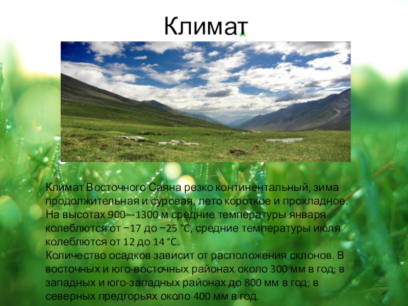 Климат Восточного Саяна резко континентальный, зима продолжительная и суровая, лето короткое