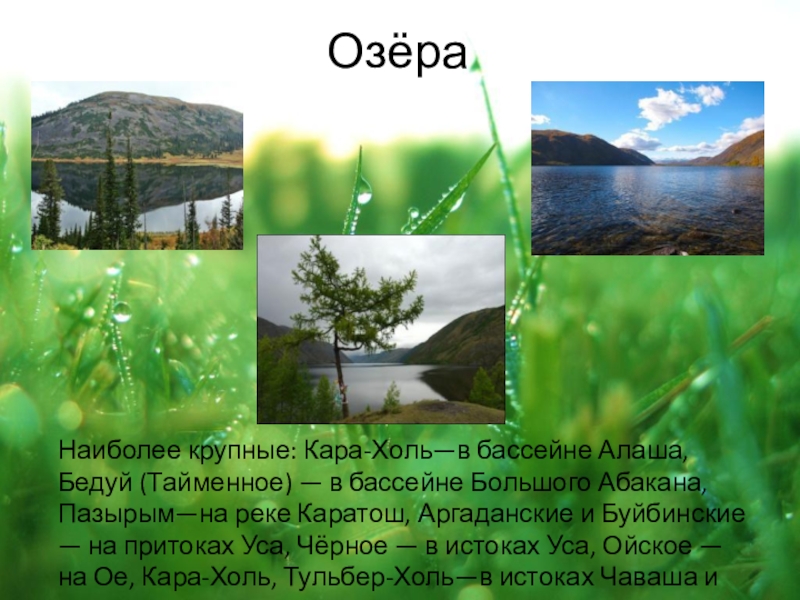 Наиболее крупные: Кара-Холь—в бассейне Алаша, Бедуй (Тайменное) — в бассейне Большого