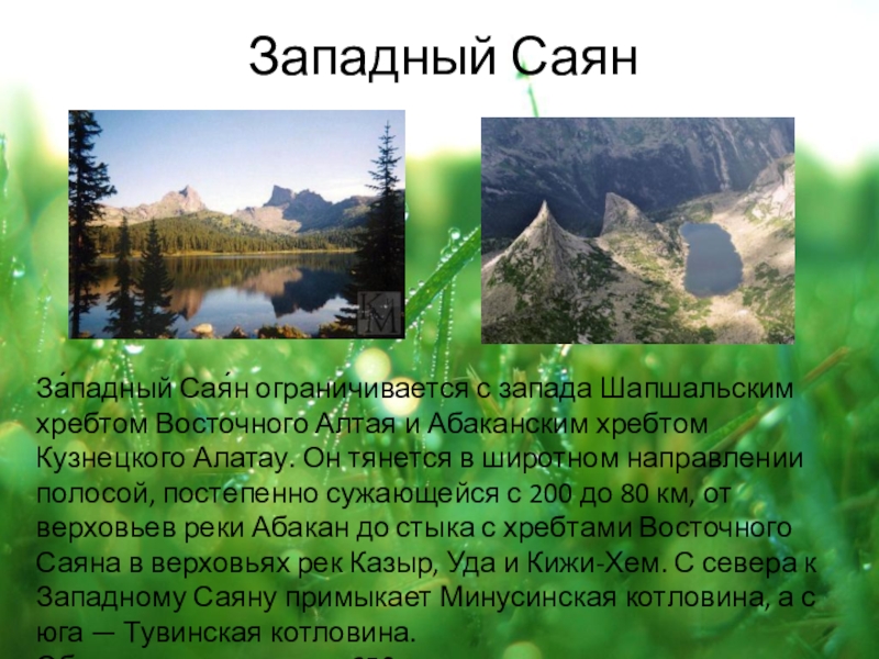 За́падный Сая́н ограничивается с запада Шапшальским хребтом Восточного Алтая