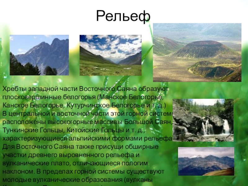 Для Восточного Саяна также присущи обширные участки древнего выровненного рельефа и вулканические плато, отличающиеся пологим наклоном. В пределах горной системы существуют молодые вулканические образования (вулканы Кропоткина, Перетолчина и др.).