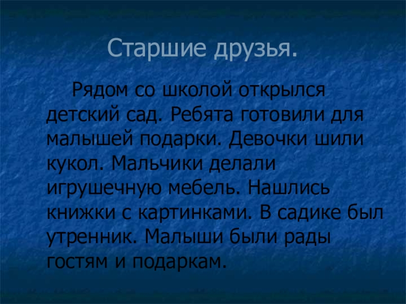 Старшие друзья. Рядом со школой открылся детский сад. Ребята готовили для малышей подарки. Девочки шили кукол. Мальчики делали игрушечную мебель. Нашлись книжки с картинками. В садике был утренник. Малыши были рады гостям и подаркам.