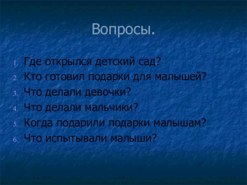 Вопросы.Где открылся детский сад?Кто готовил подарки для малышей?Что делали девочки?Что делали мальчики?Когда подарили подарки малышам?Что испытывали малыши?