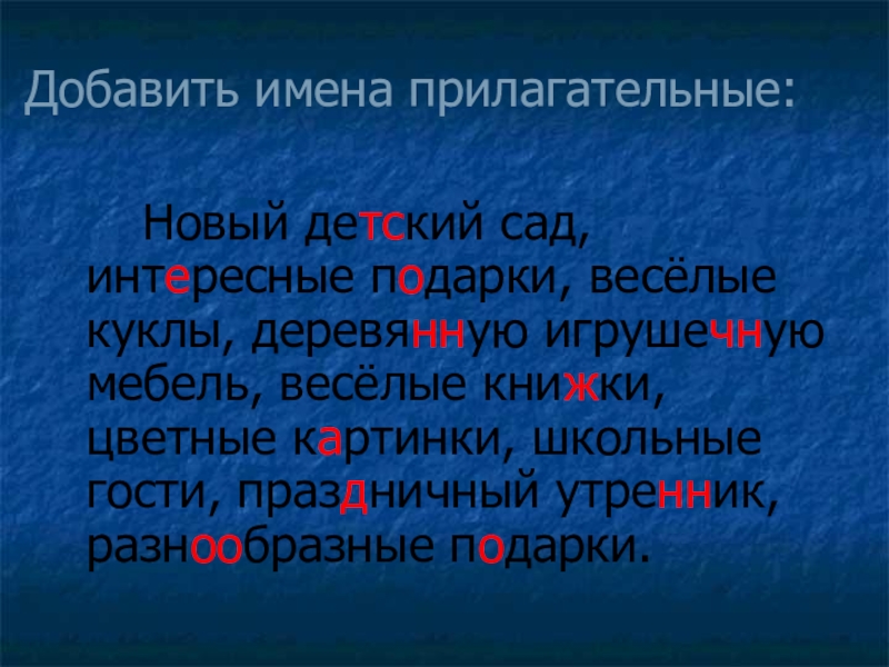 Добавить имена прилагательные:		Новый детский сад, интересные подарки, весёлые куклы, деревянную игрушечную мебель, весёлые книжки, цветные картинки, школьные