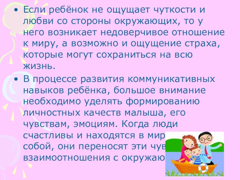 В процессе развития коммуникативных навыков ребёнка, большое внимание необходимо уделять формированию личностных качеств малыша, его чувствам, эмоциям. Когда люди счастливы и находятся в мире с самим собой, они переносят эти чувства на взаимоотношения с окружающими.