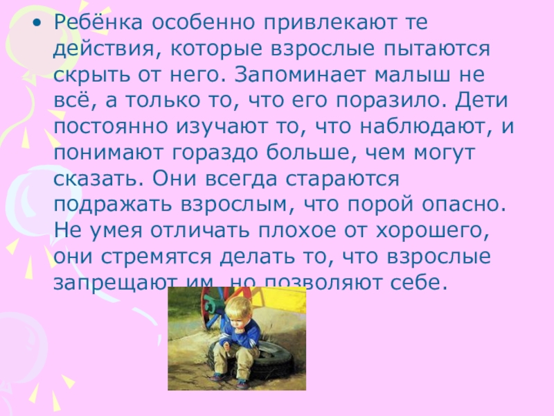 Слайд 6Ребёнка особенно привлекают те действия, которые взрослые пытаются скрыть от него.