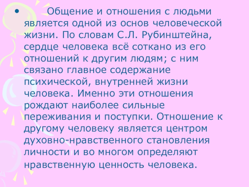 основ человеческой жизни. По словам С.Л. Рубинштейна, сердце человека всё соткано из его отношений к другим людям; с ним связано главное содержание психической, внутренней жизни человека. Именно эти отношения рождают наиболее сильные переживания и поступки. Отношение к другому человеку является центром духовно-нравственного становления личности и во многом определяют нравственную ценность человека.