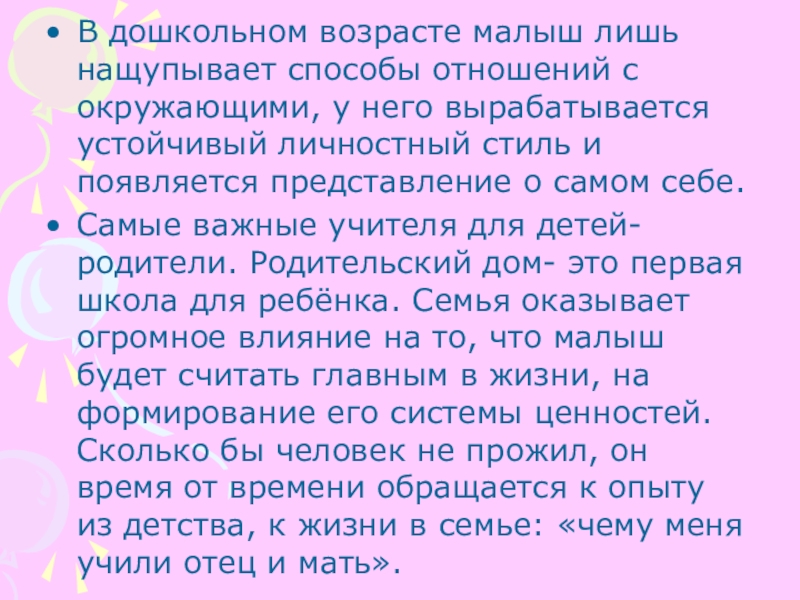 Самые важные учителя для детей- родители. Родительский дом- это первая школа для ребёнка. Семья оказывает огромное влияние на то, что малыш будет считать главным в жизни, на формирование его системы ценностей. Сколько бы человек не прожил, он время от времени обращается к опыту из детства, к жизни в семье: «чему меня учили отец и мать».