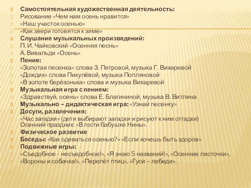 • Расширять представления об отображении осени в произведениях искусства (поэтического, изобразительного, музыкального)
