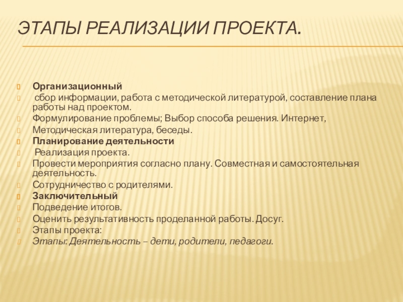 Информирование родителей о проекте: обсуждение темы проекта, выявление вариантов представления проекта.