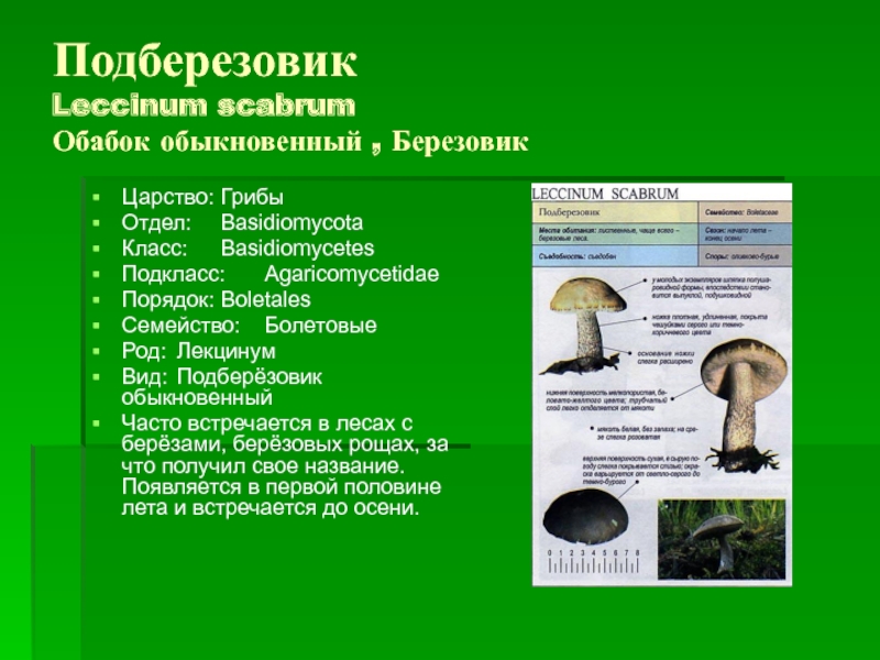 Подберезовик Leccinum scabrum Обабок обыкновенный , БерезовикЦарство:	ГрибыОтдел:	BasidiomycotaКласс:	BasidiomycetesПодкласс:	AgaricomycetidaeПорядок:	BoletalesСемейство:	БолетовыеРод:	ЛекцинумВид:	Подберёзовик обыкновенныйЧасто встречается в лесах с берёзами, берёзовых рощах, за что