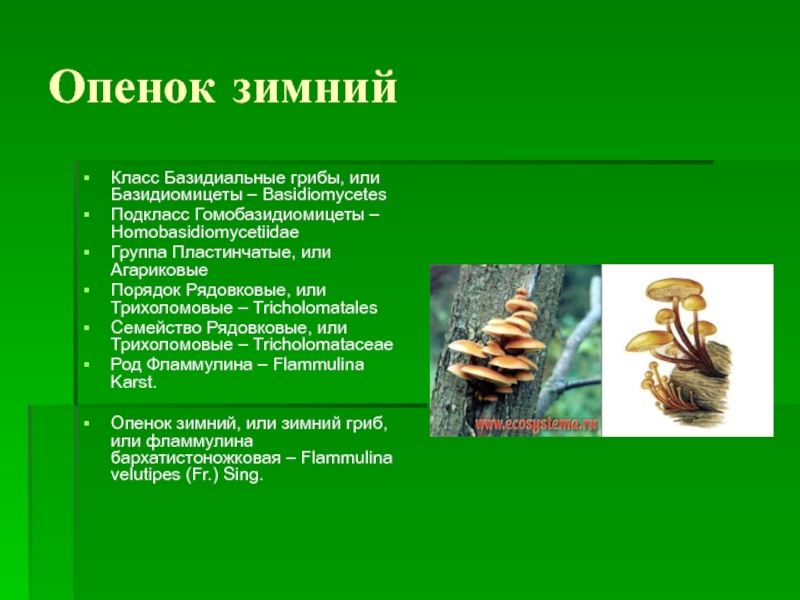 Опенок зимнийКласс Базидиальные грибы, или Базидиомицеты – BasidiomycetesПодкласс Гомобазидиомицеты – HomobasidiomycetiidaeГруппа Пластинчатые, или АгариковыеПорядок Рядовковые, или Трихоломовые