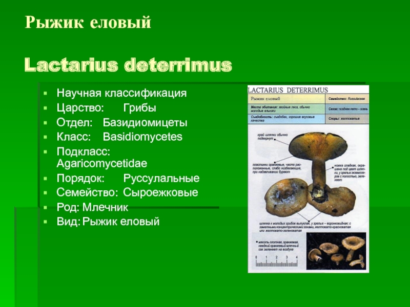 Рыжик еловый  Lactarius deterrimusНаучная классификацияЦарство:	ГрибыОтдел:	БазидиомицетыКласс:	BasidiomycetesПодкласс:	AgaricomycetidaeПорядок:	РуссулальныеСемейство:	СыроежковыеРод:	МлечникВид:	Рыжик еловый