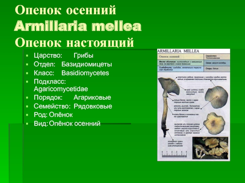 Опенок осенний Armillaria mellea Опенок настоящийЦарство:	ГрибыОтдел:	БазидиомицетыКласс:	BasidiomycetesПодкласс:	AgaricomycetidaeПорядок:	АгариковыеСемейство:	РядовковыеРод:	ОпёнокВид:	Опёнок осенний