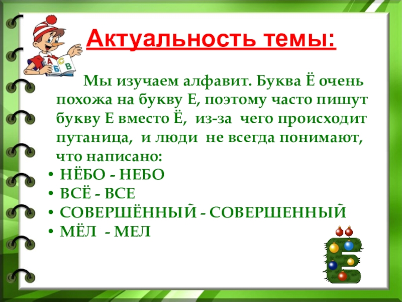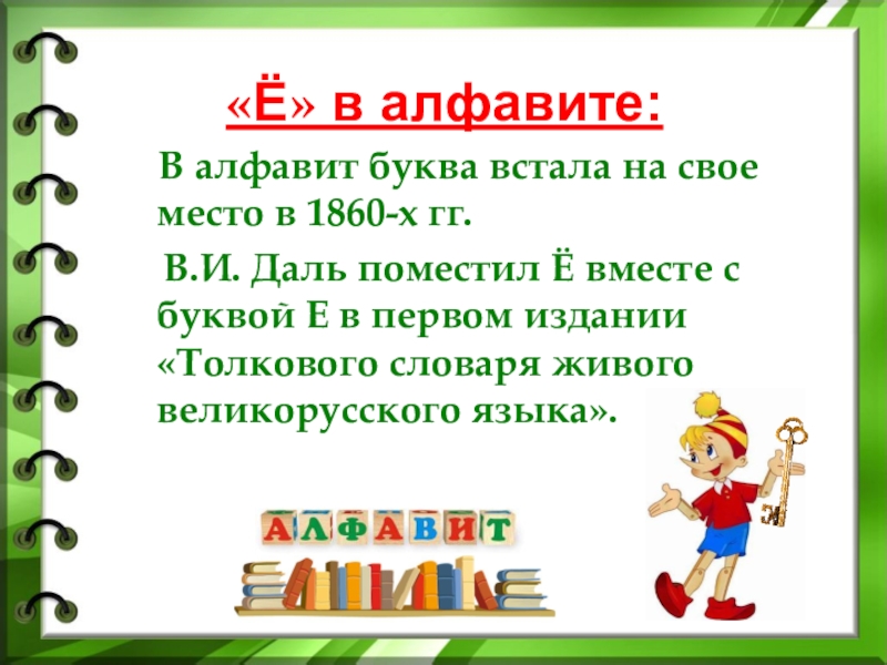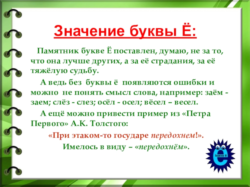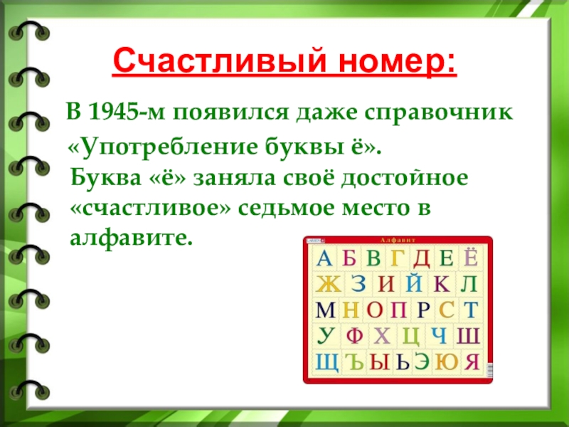«Употребление буквы ё». Буква «ё» заняла своё достойное «счастливое» седьмое место в алфавите.
