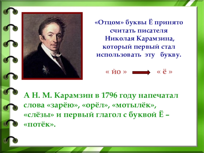 А Н. М. Карамзин в 1796 году напечатал слова «зарёю», «орёл», «мотылёк», «слёзы» и первый глагол с буквой Ё – «потёк».