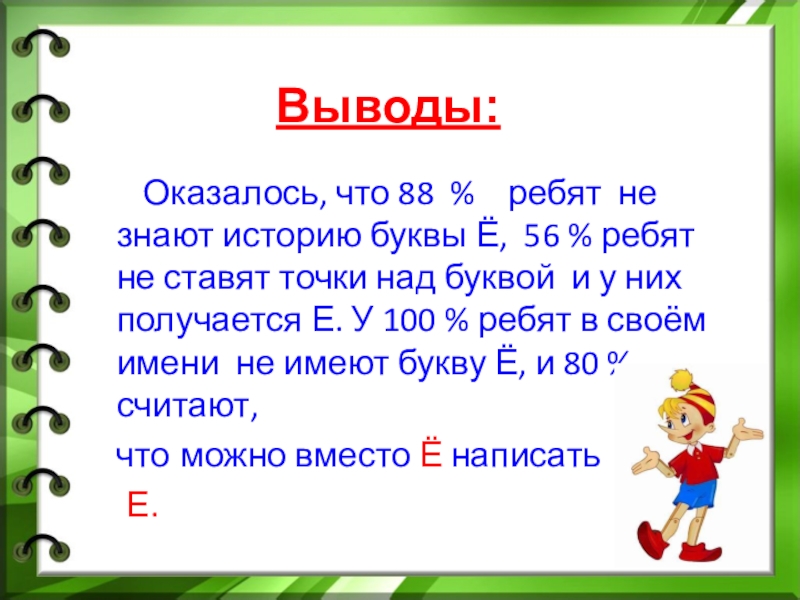 ребят не знают историю буквы Ё, 56 % ребят не ставят точки над буквой и у них получается Е. У 100 % ребят в своём имени не имеют букву Ё, и 80 % считают,