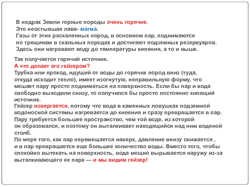 Трубка или проход, идущий от воды до горячих пород вниз (туда, откуда исходит тепло), имеет изогнутую, неправильную форму, что мешает пару просто подниматься на поверхность. Если бы пар и вода свободно выходили снизу, то получился бы просто постоянно кипящий источник.