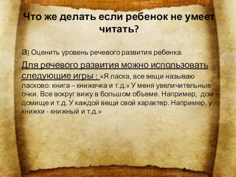 Для речевого развития можно использовать следующие игры : «Я ласка, все вещи называю ласково: книга – книжечка и т.д.» У меня увеличительные очки. Все вокруг вижу в большом объеме. Например, дом – домище и т.д. У каждой вещи свой характер. Например, у книжки - книжный и т.д.»