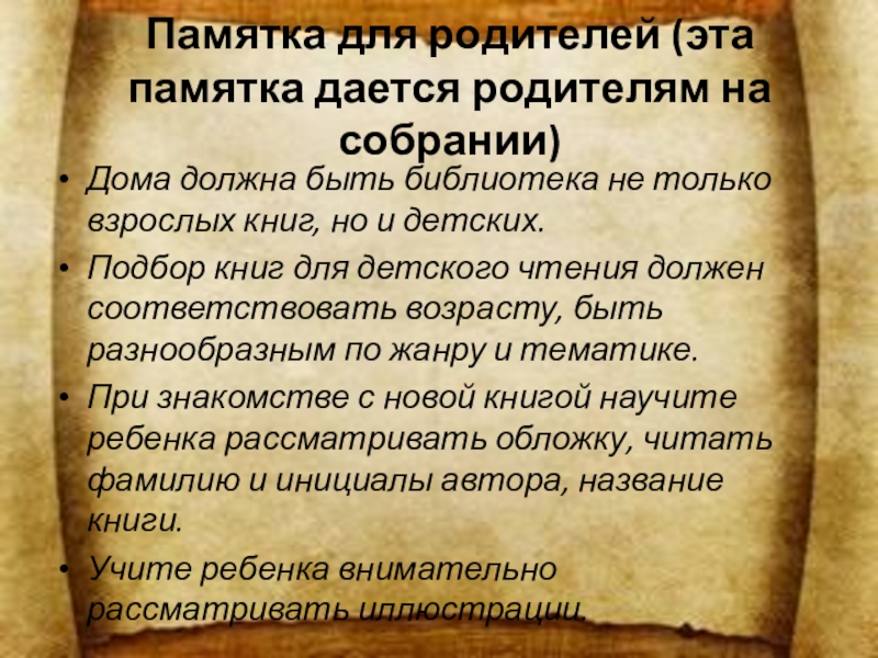 Слайд 14Памятка для родителей (эта памятка дается родителям на собрании)