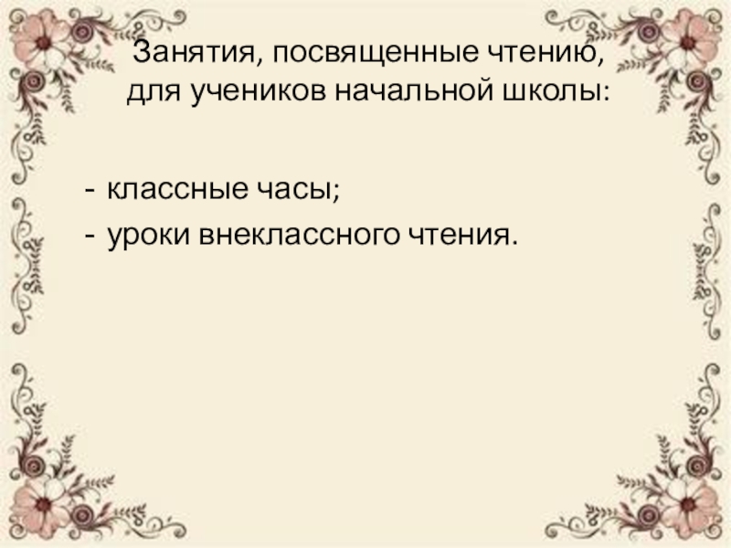 Слайд 19Занятия, посвященные чтению, для учеников начальной школы: