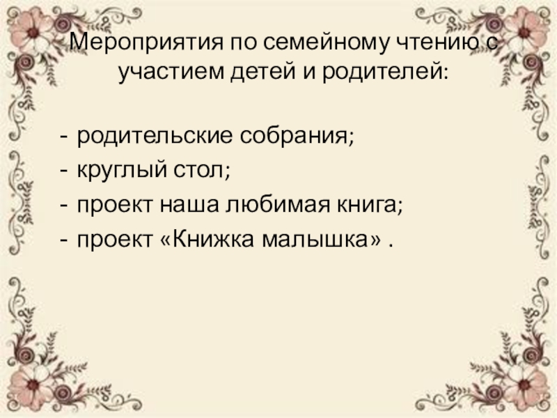 Слайд 20Мероприятия по семейному чтению с участием детей и родителей: