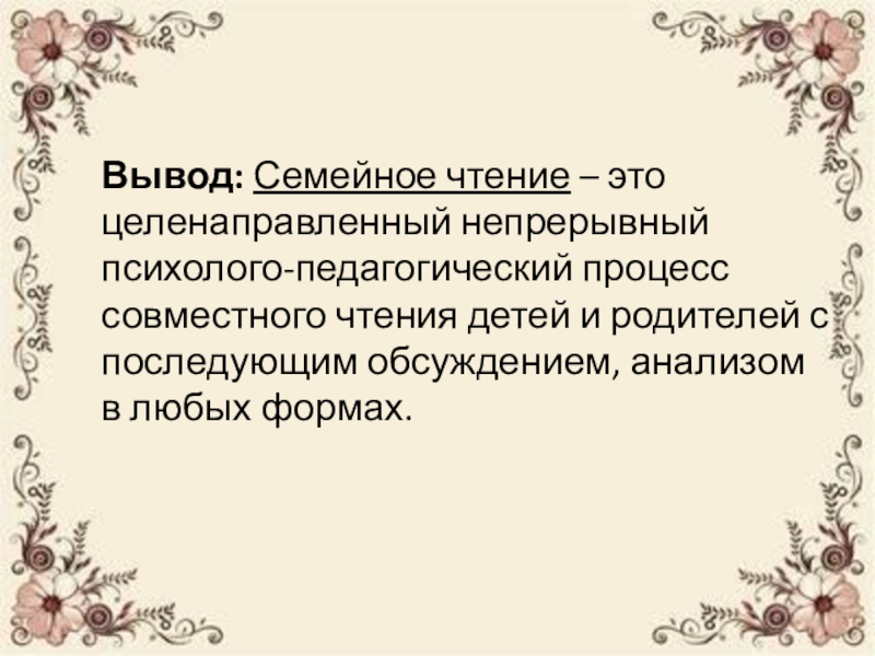 Слайд 21Вывод: Семейное чтение – это целенаправленный непрерывный психолого-педагогический процесс совместного чтения