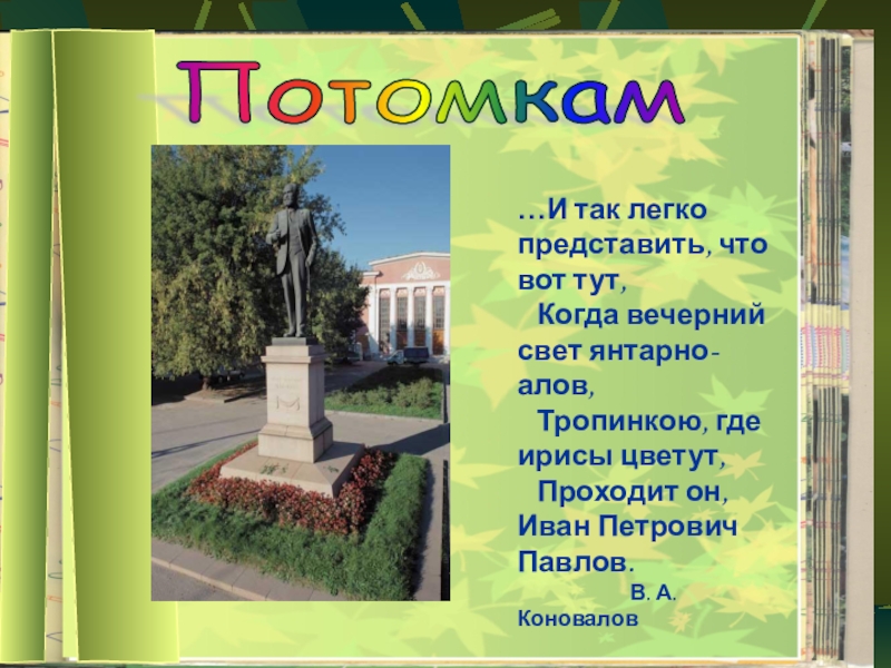 Потомкам …И так легко представить, что вот тут,  Когда вечерний свет янтарно-алов,  Тропинкою, где ирисы
