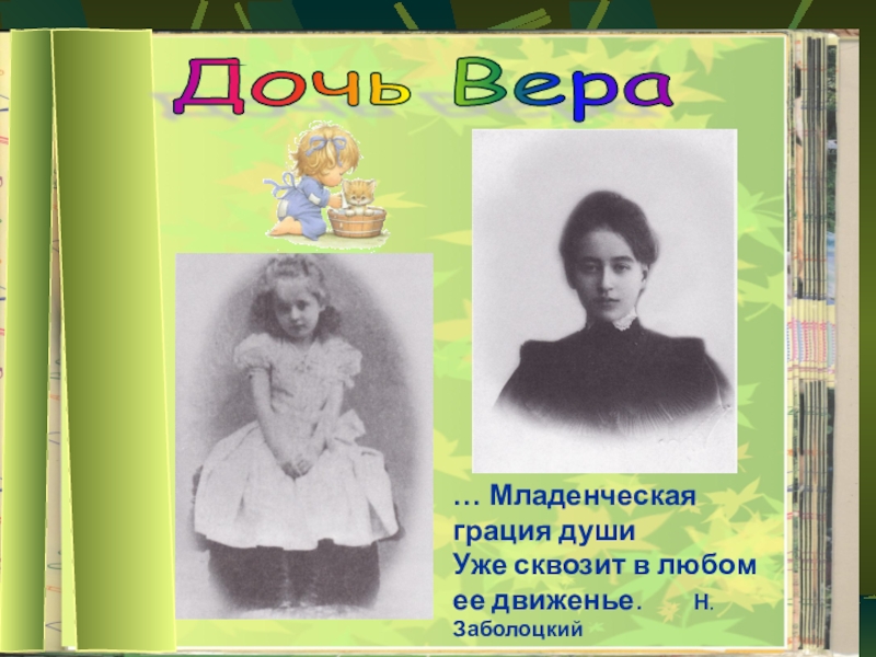 Дочь Вера … Младенческая грация душиУже сквозит в любом ее движенье.    Н. Заболоцкий