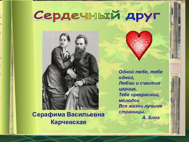 Серафима Васильевна КарчевскаяСердечный друг Одной тебе, тебе одной,Любви и счастия царице,Тебе прекрасной, молодойВсе жизни лучшие страницы.