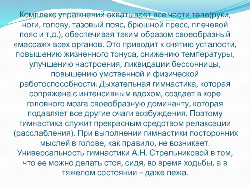 пресс, плечевой пояс и т.д.), обеспечивая таким образом своеобразный «массаж» всех органов. Это приводит к снятию усталости, повышению жизненного тонуса, снижению температуры, улучшению настроения, ликвидации бессонницы, повышению умственной и физической работоспособности. Дыхательная гимнастика, которая сопряжена с интенсивным вдохом, создает в коре головного мозга своеобразную доминанту, которая подавляет все другие очаги возбуждения. Поэтому гимнастика служит прекрасным средством релаксации (расслабления). При выполнении гимнастики посторонних мыслей в голове, как правило, не возникает.
