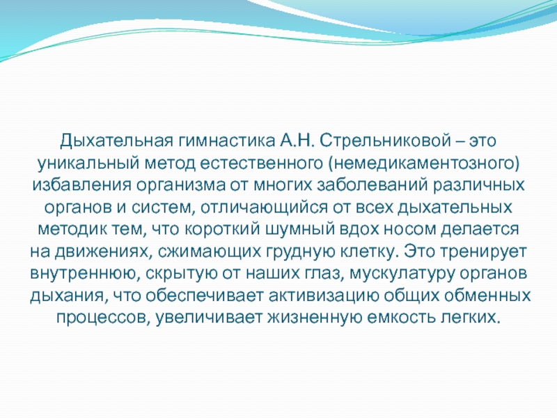 Слайд 2 Дыхательная гимнастика А.Н. Стрельниковой является методом комплексного воздействия на весь организм